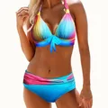 Halter Swimwear Women Gradient Blue Swimsuit Tankini Lower Waist Bottom 2Pcs Bikini Set Cutout Back